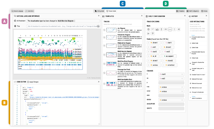 A learnable coding/authoring of interactive data visualization through blending interfaces, including LLM-based chatbot, code editor, and chart templates.